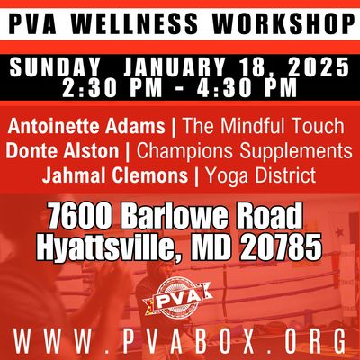 The Potomac Valley Association (PVA) is hosting a wellness-focused athlete workshop designed to equip our athletes with practical tools to support training, recovery, and overall performance. This session brings together experienced professionals in sports therapy, nutrition, and yoga to address the physical and mental demands of boxing.